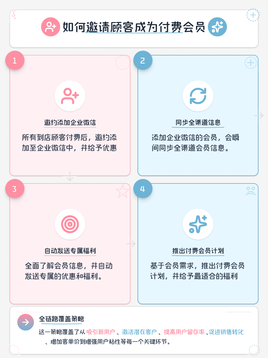 二、四步搭建付费会员体系📍第一步:设计钩子,强制加微顾客首单支付后,立即引导添加企业微信。这个动作必须做,后续所有运营都基于私域触达。现场给优惠券或小礼品作为加微利益点。第二步:信息同步,打标签企业微信打通全渠道会员数据,自动同步消费记录、偏好标签。没有数据的会员运营都是空谈。