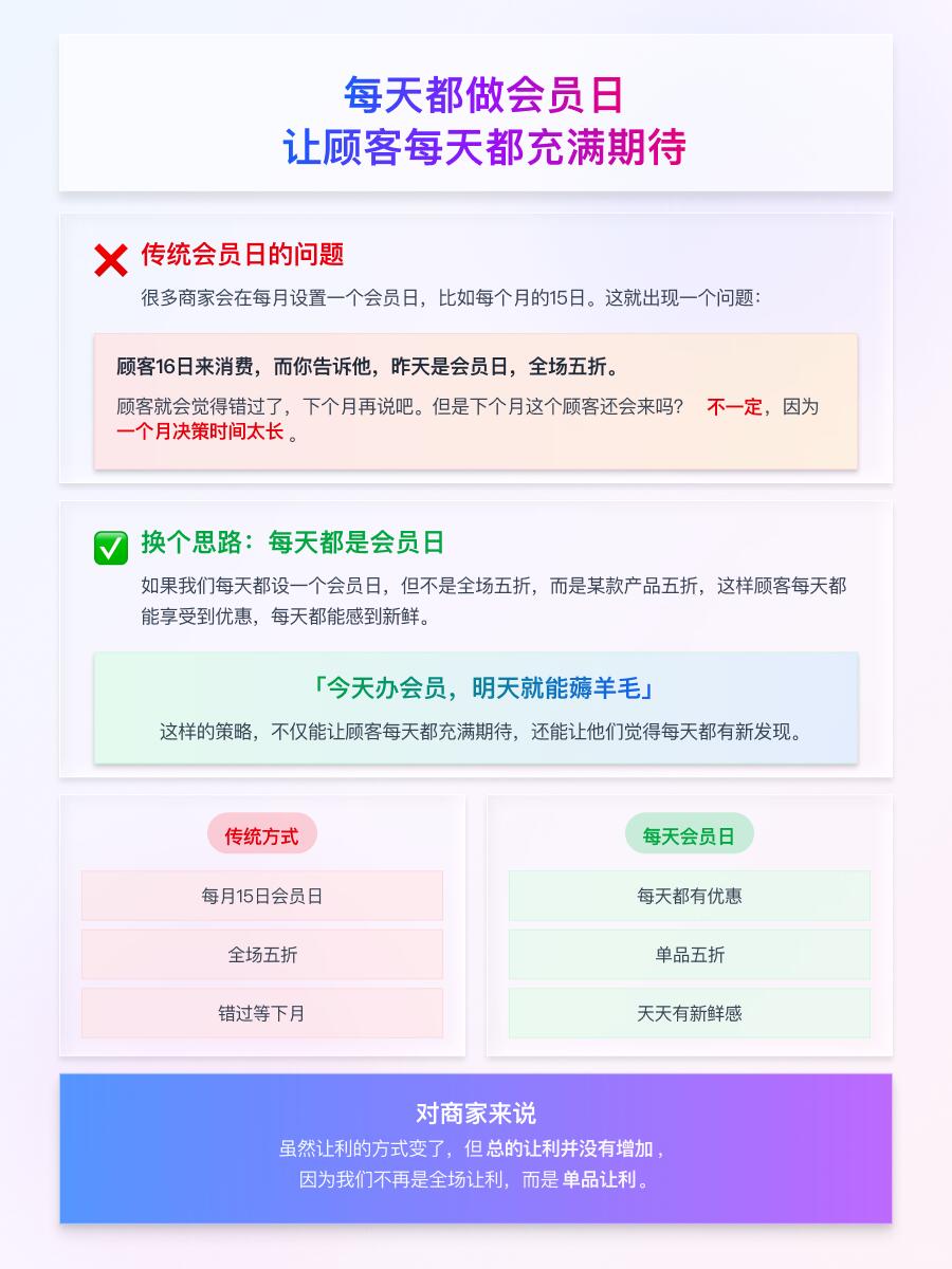 📅 每天都是会员日,但不用全场五折 传统每月15日会员日弊端太明显 顾客16号来消费,你告诉他昨天五折 他只会觉得错过,下个月不来了