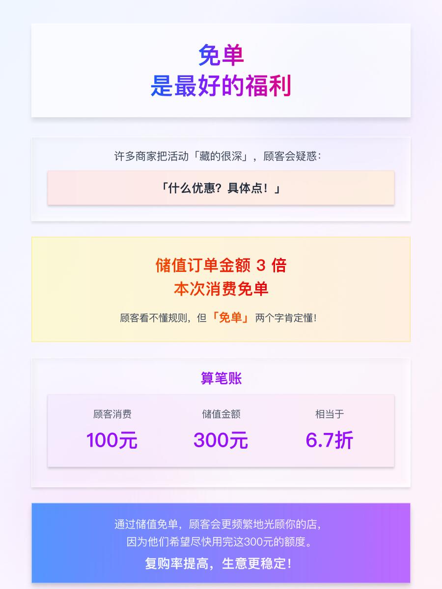 📈 免单是最直白的会员福利 别搞复杂规则,顾客看不懂 直接上「储值本次金额3倍,本次免单」 消费100元,储值300元,相当于6.7折 顾客秒懂,复购动力拉满 💰