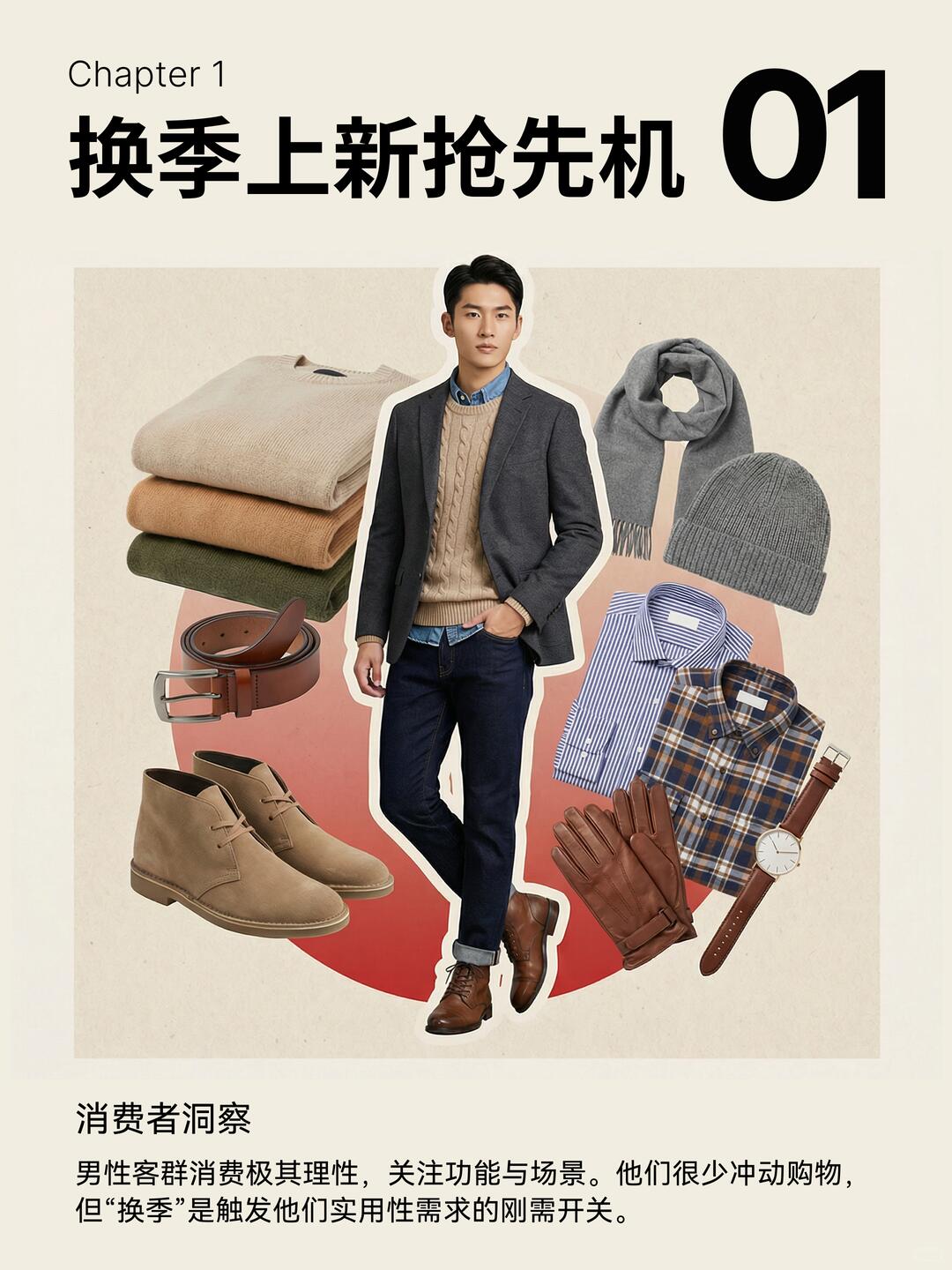 📍 洞察: 男人买衣服极度理性,只有“换季”是刚需开关。