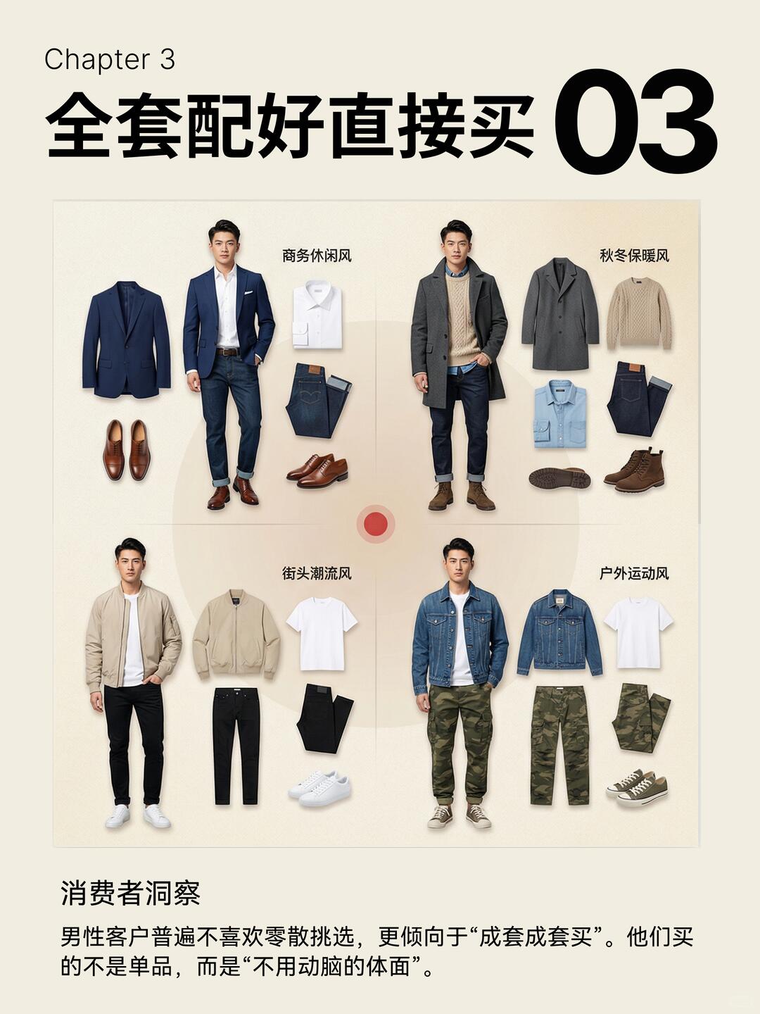 📍 洞察: 男人不喜欢零卖,他们买的是“不用动脑的体面”。