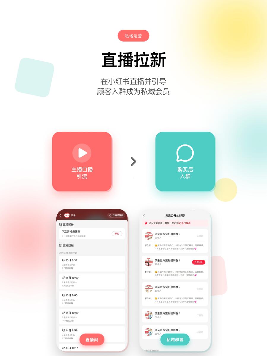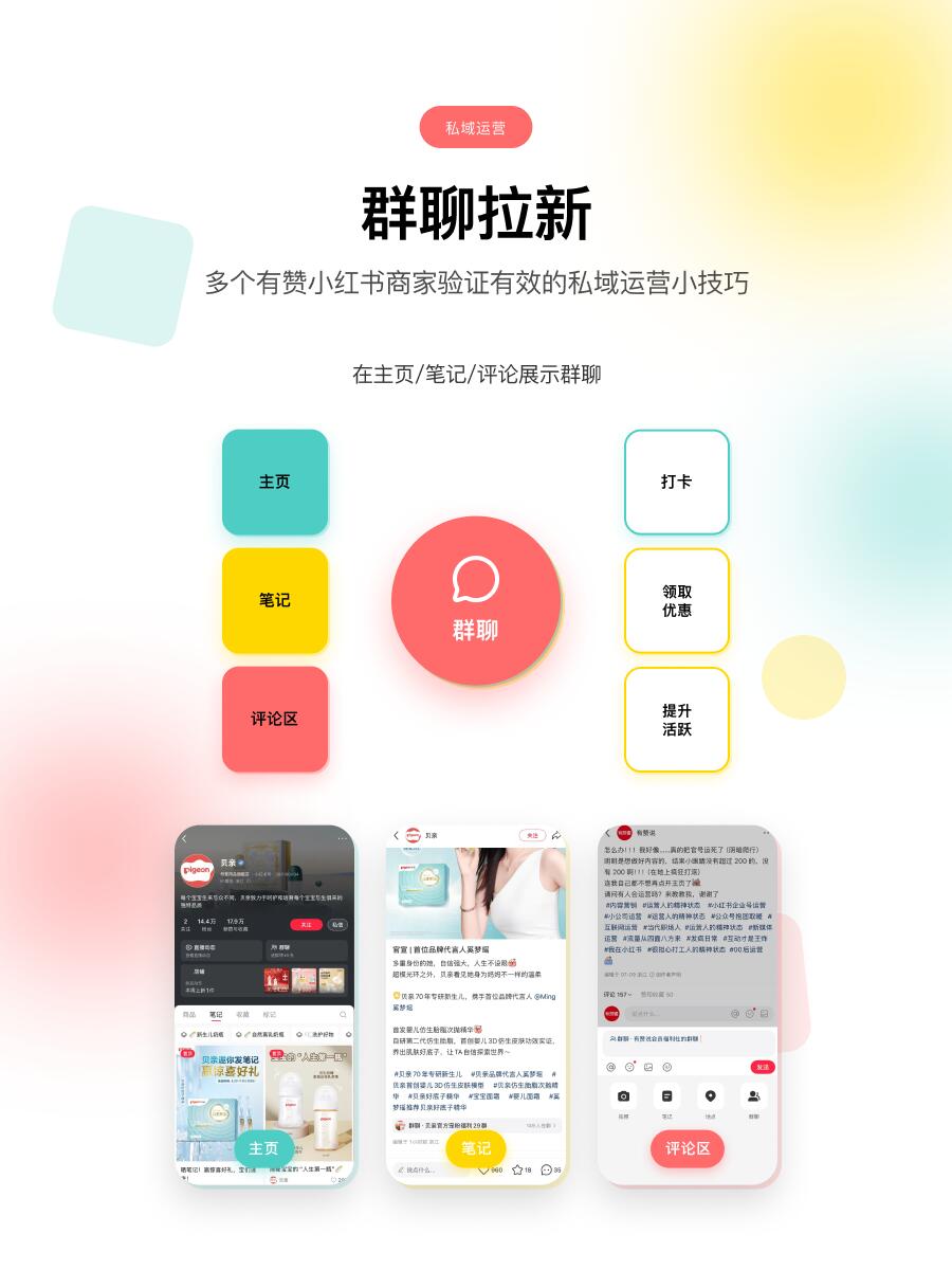 一、拉新:三层入口+直播钩子 流量不进社群等于白搭。必须在三个黄金位置设置入群通道:主页群聊入口、优质笔记挂载、评论区置顶链接。以贝亲为例,主页直接展示"官方宠粉福利群",笔记引导"领取优惠",评论区放置入群链接,三步降低用户决策门槛。 直播是拉新放大器。主播口播"进群领5元无门槛券",设置"进入任一群聊自动发券"功能。