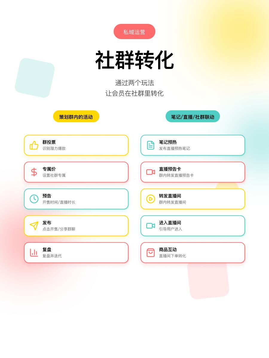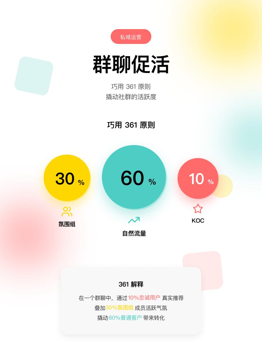 二、促活:361原则激活沉默用户 社群最怕"死群"。361黄金法则经过验证:10%忠诚KOC真实推荐+30%氛围组(店员/亲友)主动晒单互动+60%普通用户被带动自然转化。 具体操作:每周发起群投票选新品、限时秒杀预告、专属红包雨。数据显示,氛围组每周发起3次话题,可将社群活跃度从15%提升至65%。