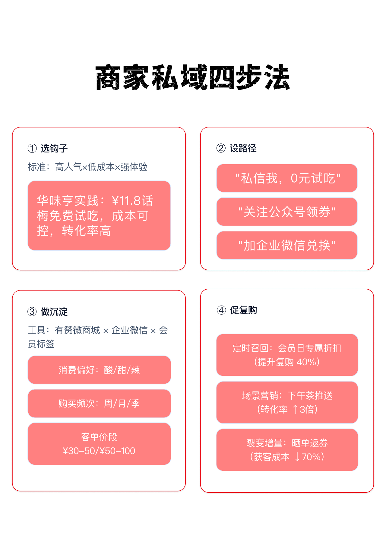 第四步促复购。 每月固定会员日给专属折扣,能提升40%复购率;下午三点推下午茶场景,转化率翻3倍;让用户晒单返券,获客成本直降70%。