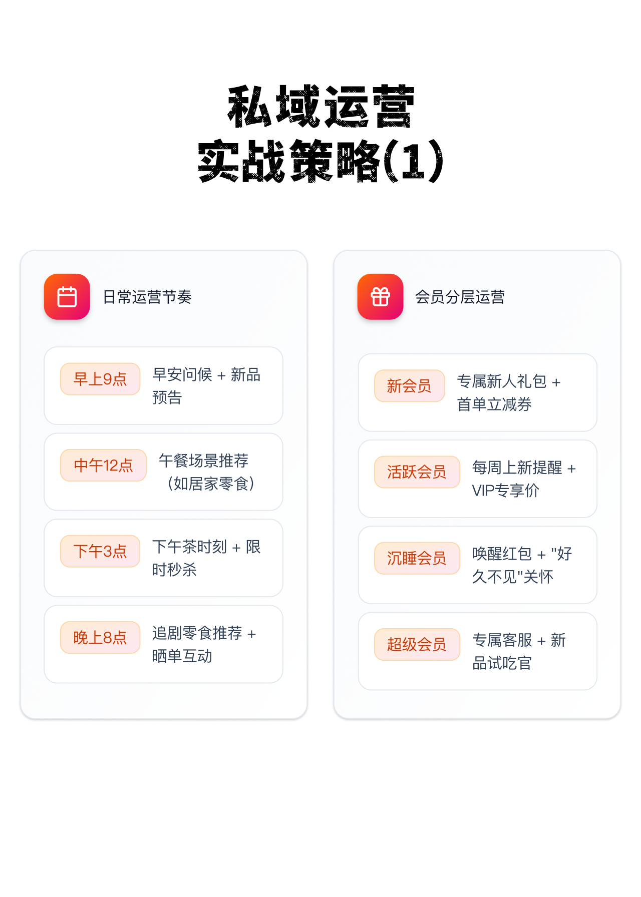 日常运营记住四个时间点: 早上9点发新品预告,中午12点推居家零食,下午3点做限时秒杀,晚上8点搞晒单互动。同时把用户分层:新会员给首单立减,活跃会员给VIP专享价,沉睡会员发唤醒红包,超级会员配专属客服。