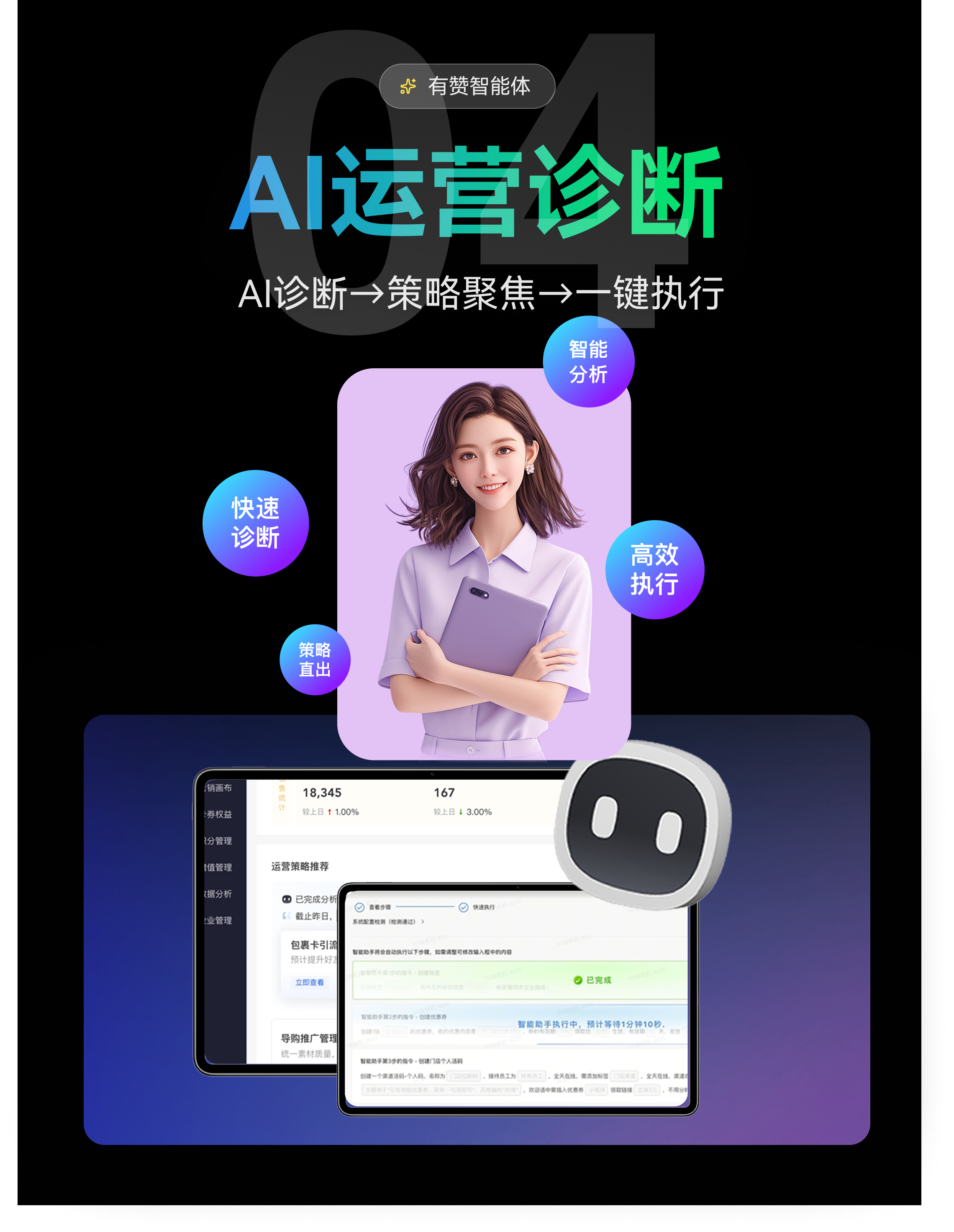 AI自动诊断业绩瓶颈,从300+大牌案例库匹配最佳策略,诊断完一键执行,实战派老中医。