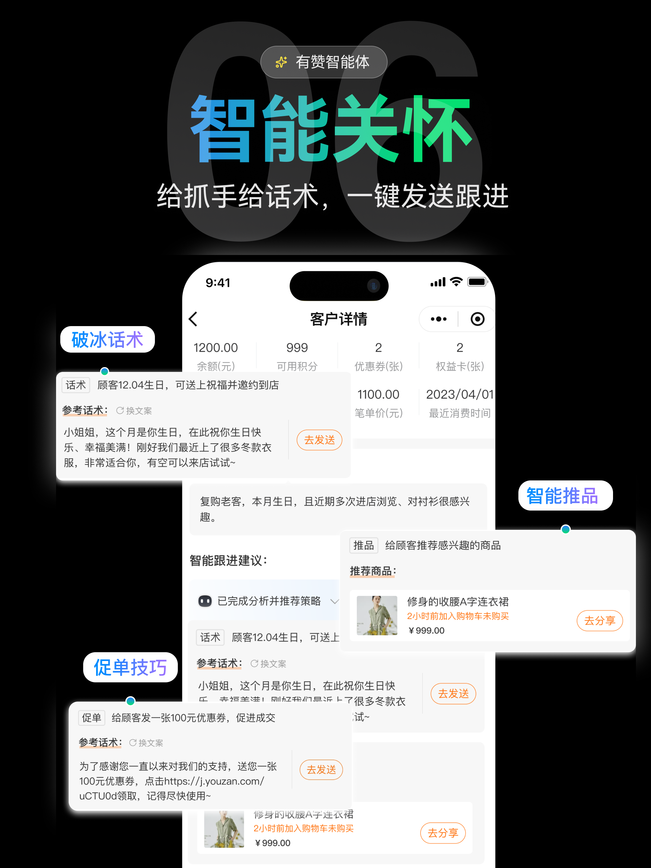 AI自动监控会员生日、积分到期、签收、退款等节点,推送关怀提醒,让客户感受品牌温度,不错过升温机会。