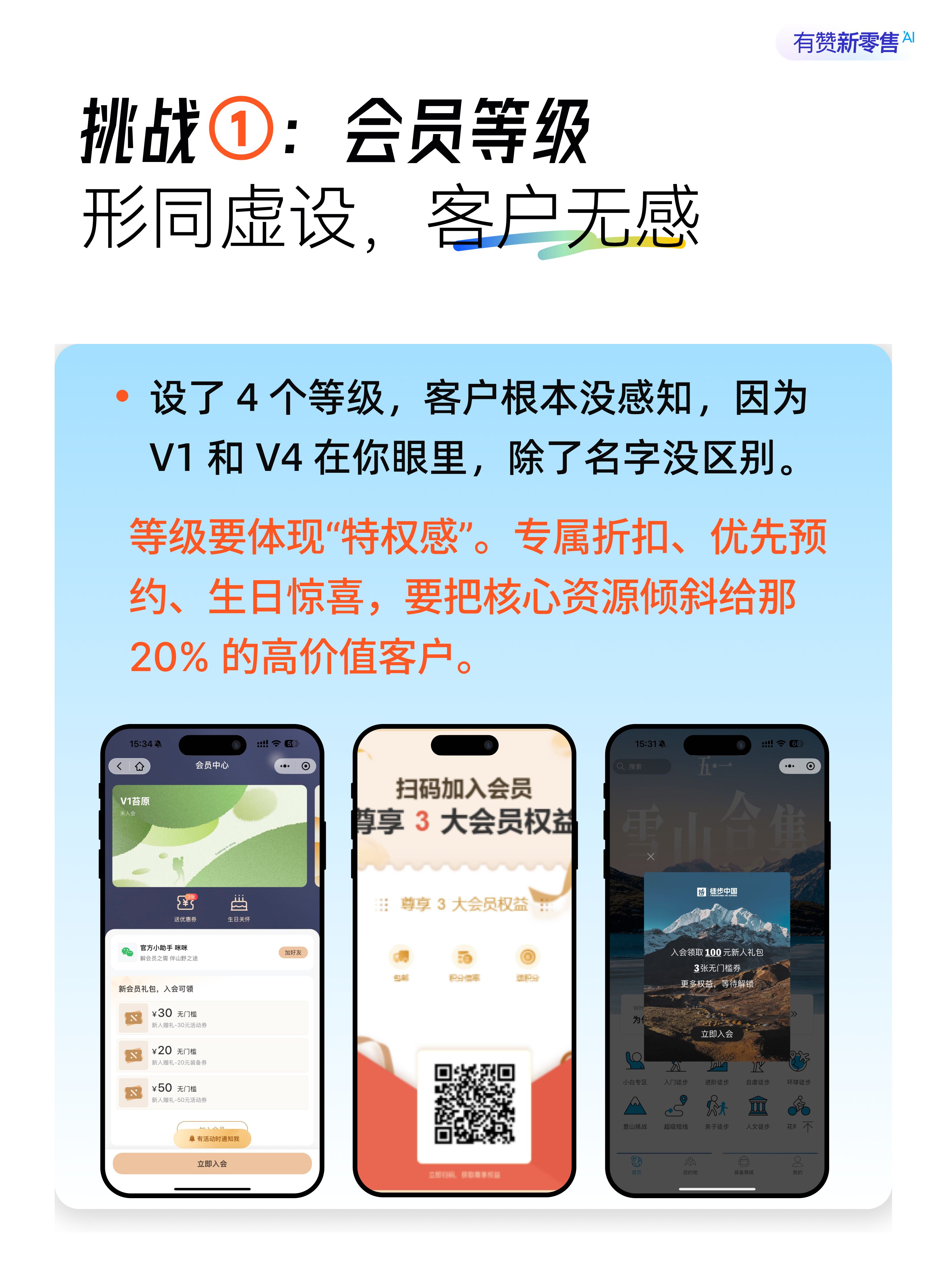 设置了4个等级,权益却没抢。客户该走还是走,因为V1和V4都在你眼里,除了名字没区别。