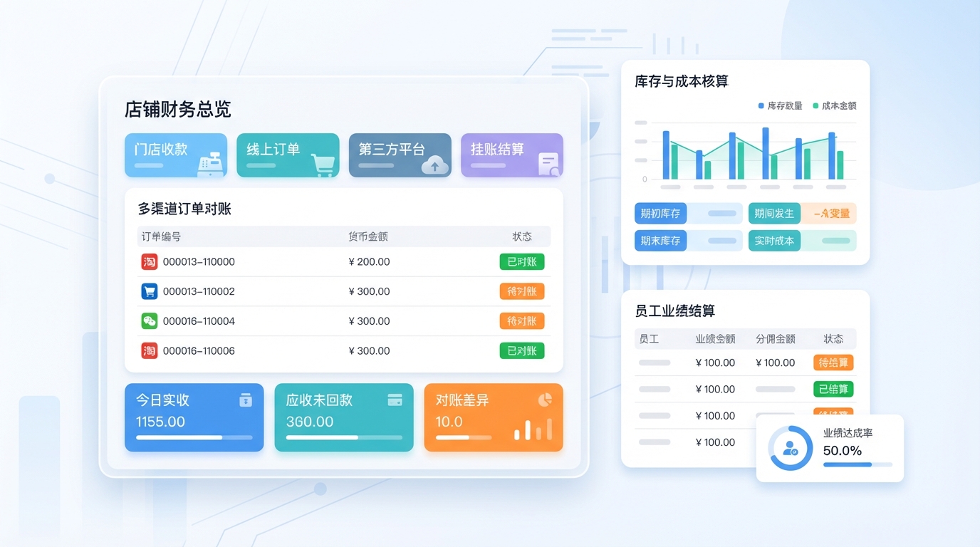 店铺账目管理工具是一款面向线下门店及多渠道零售商的财务管理产品,通过多渠道订单对账、库存与成本核算、员工业绩结算及资金安全管控,帮助商家实现账实相符、利润清晰与风险可控的精细化经营管理。