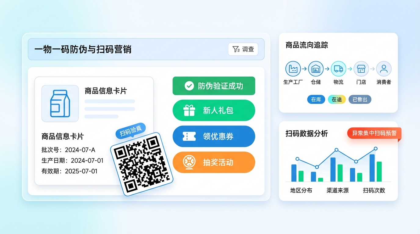 「一物一码防伪查询 - 商品溯源与扫码营销」通过为每件商品生成唯一二维码,实现防伪溯源、全程流通追踪与扫码互动营销,帮助品牌精细化管理渠道库存,沉淀会员数据,提升复购率与品牌信任度。