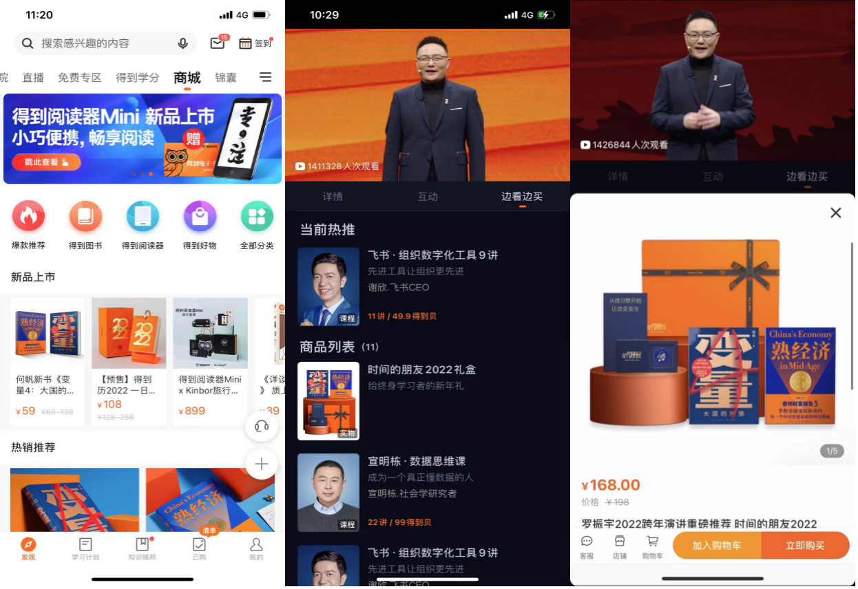 4、商家说:得到 App 在 21 年开始接入使用有赞,我们选择使用了 App 开店的解决方案,快速在得到 App 里面搭建了商城系统。有赞提供了强有力的技术保障,在 21 年的《时间的朋友》跨年演讲活动,通过有赞商城进行售卖实物,有赞系统平稳运行,完美的保障了我们的跨年活动。