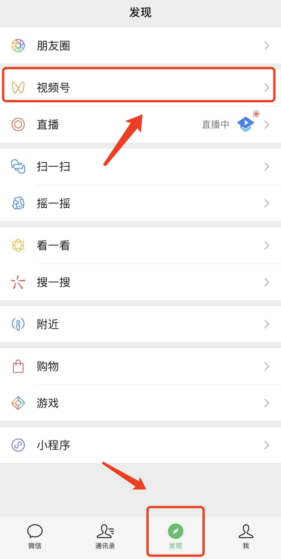 1.打开微信客户端,点击底部“发现”按钮,在页面上方找到“视频号”,点击进入;