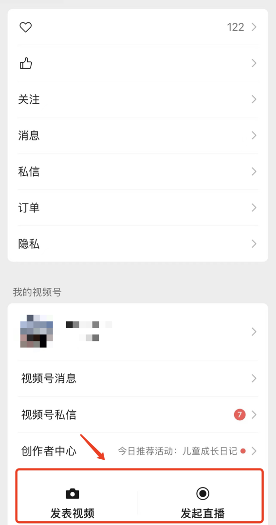 3.进入个人主页之后,可以看到下方“我的视频号”,底部可以分别选择“发表视频”、“发起直播”,即可开通视频号;