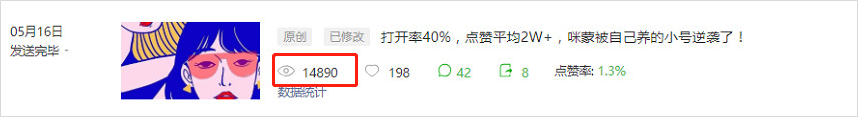 最后我们选择了“打开率 40%,点赞平均 2W+”。标题为《打开率40%,点赞平均2W+,咪蒙被自己养的小号逆袭了!》,阅读量是一般文章的 3 倍。