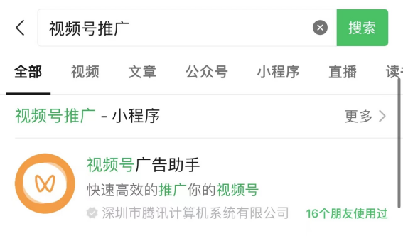 (1)微信搜索视频号推广,找到“视频号推广助手”;