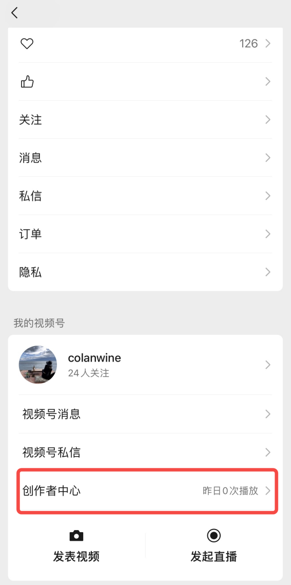 1.打开微信,点击底部第三个按钮“发现”,进入视频号,点击右上角个人中心,下拉找到“创作者中心”;