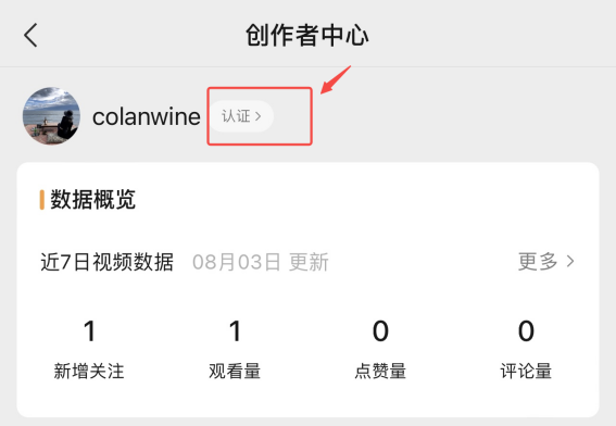 2.进入创作者中心,点击头像名称右侧的“认证”,进入认证页面;