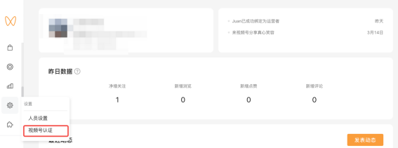 登陆视频号助手后台,点击左侧功能按钮“设置”,进入“视频号认证”,点击左侧按钮“申请企业认证”并按步骤填写相关资料即可。