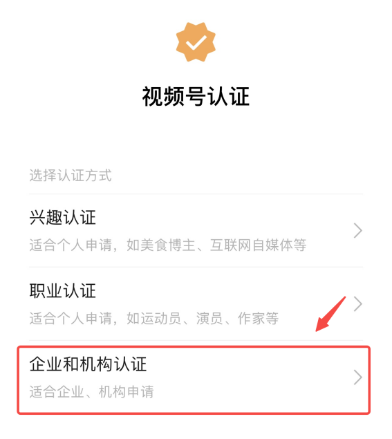 3.点击进入认证页面之后,可以看到有3个不同的认证选项,今天主要讲的是企业和机构认证,企业视频号申请认证,选择底部第三个选项;
