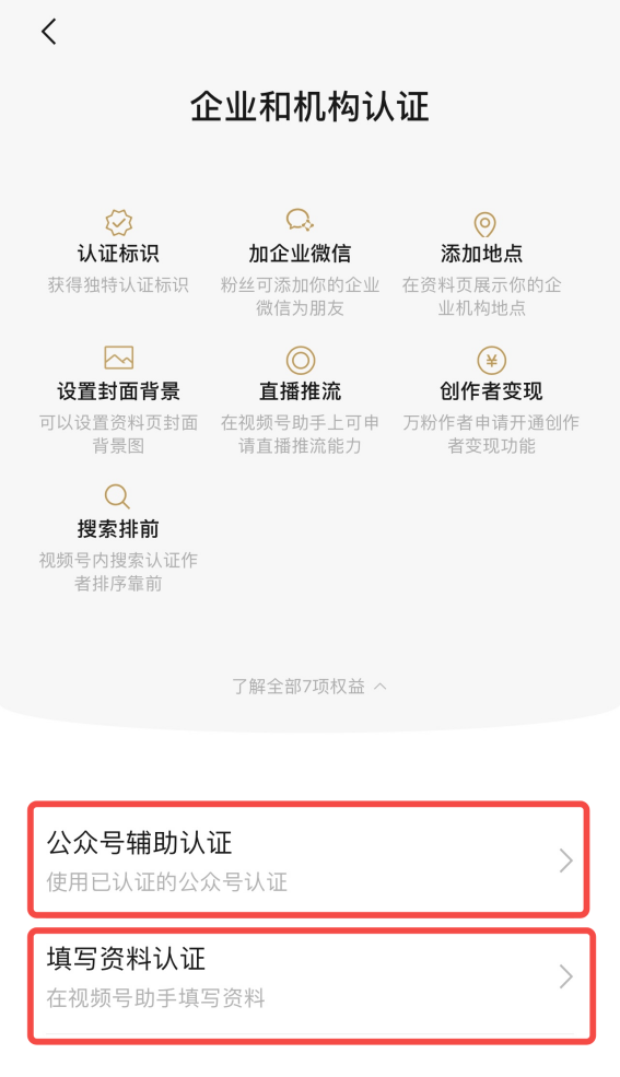 4.进入企业和机构认证界面,可以看到企业认证的一些专属权益,下方就是申请企业视频号认证的2种途径:公众号辅助认证和填写资料认证。