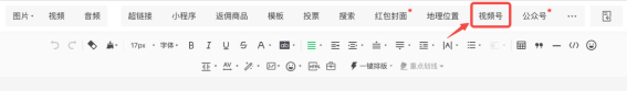 文章编辑页面有一行菜单栏,找到“视频号”并点击进入;搜索视频号,选择对应的视频并插入即可完成。