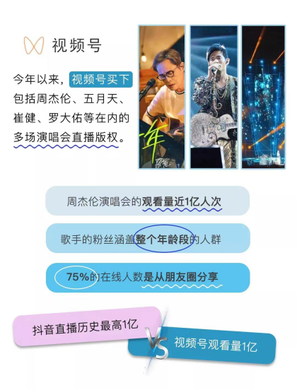 相信今年,大家都在微信朋友圈里刷到过很多演唱会直播,这些直播的歌手粉丝涵盖了几乎整个年龄段的消费人群,且单场直播的在线人数都十分可观,周杰伦2022年两场演唱会的总观看量接近1亿人次,其中75%的在线人数都是从朋友圈分享进入的。