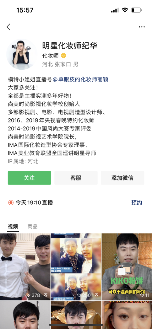 这个简介内容不仅能让大家很好的认识视频号,更能辅助制造视频号的权威性,比如以下视频号【明星化妆师纪华】。在他的简介里,90%的内容都在介绍他作为化妆师的身份参与了哪些大型项目,例如央视春晚。那么用户对于他的认知一下子就有了信赖感,通过众所周知的成就提高自己所展现内容的专业性,是这类简介最大的功效,那么内容辅助一些跟明星或KOL的合影,久而久之,用户就更能产生了学习或买货的天然需求。