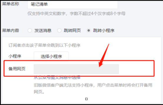 如果事先没有关联过小程序,可以点击蓝色字体的“小程序-小程序管理”,按照步骤,一步步完成小程序的关联工作,然后再按照上述步骤进行操作即可。公众号菜单栏怎么添加小程序?以上这些操作是非常简单的,但工作中我们可能会遇到这样的问题:例如我们点击我们想要跳转的小程序,点击确认后,却发现添加不进去的问题,出现这种情形,我们怎么解决?这时,只需要在“备用网页”这里输入小程序的链接就可以了。