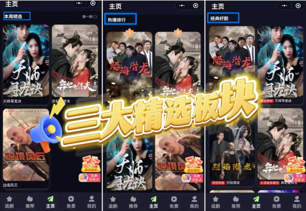 进入【主页】,继续下滑有本周精选,热播排行,经典好剧三个栏目。