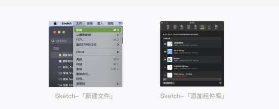 我们在Sketch里也可以找到相同的用法,添加组件库是从本地已有的组件库集合中选择其中一个并添至Sketch的组件库里,而新建主要用在创建一个新的画板。前者强调增加,后者强调从无到有的搭建过程。
