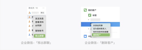 我们并不希望产品设计者一板一眼地只能在这两个词汇中二选一,所有术语的使用应该贴近用户心智,让用户了解当下语境并引导其做出正确的决策才是我们的最终目的。在企业微信里,如果你想把成员从群聊中移走,系统使用的是“移出群聊”而不是“移除客户”,而在通讯录里,如果你不希望和某人联系,就可以使用“删除客户”将其永久删除。从场景上看,“移出群聊”在语义上理解是从当前群里移走,但本身用户并没有被删除,更强调操作的临时性,从使用者的角度出发,是不是比「移除客户」更人话?