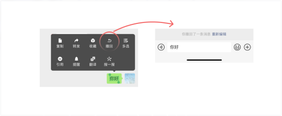 有时候原先不属于错误,操作之后才发现错了已经误操作了,无法实时的调整,这时候可以帮助用户恢复到原先状态。 举个例子,微信发送信息之后,如果用户觉得信息发送错了,这时候提供了撤回的功能,可以恢复到发送之前的状况,让用户可以重新编辑。