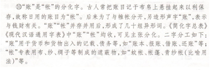 翻译成大白话就是:以前只有“帐”,因为钱都是记在布上的;后来为了区别,跟钱有关的换成了“账”。