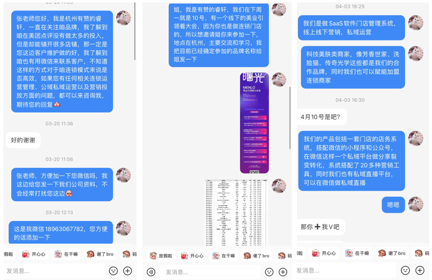 这是一家做产品供应链的连锁加盟品牌,通过话术加到微信,后来邀约到了门罗,该品牌市场负责人、运营负责人都有到现场