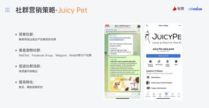 Juicy Pet独立站上线当日便开启第一次社群营销服务。上线的前6个小时,AllValue在加拿大本地的各宠物垂直类的海外微信群、Facebook Group、Telegram等50个社群,发布商家即将开启的促销信息并抛出商家给出的折扣,吸引社群中的消费者在第一时间抢购商家的优意。
