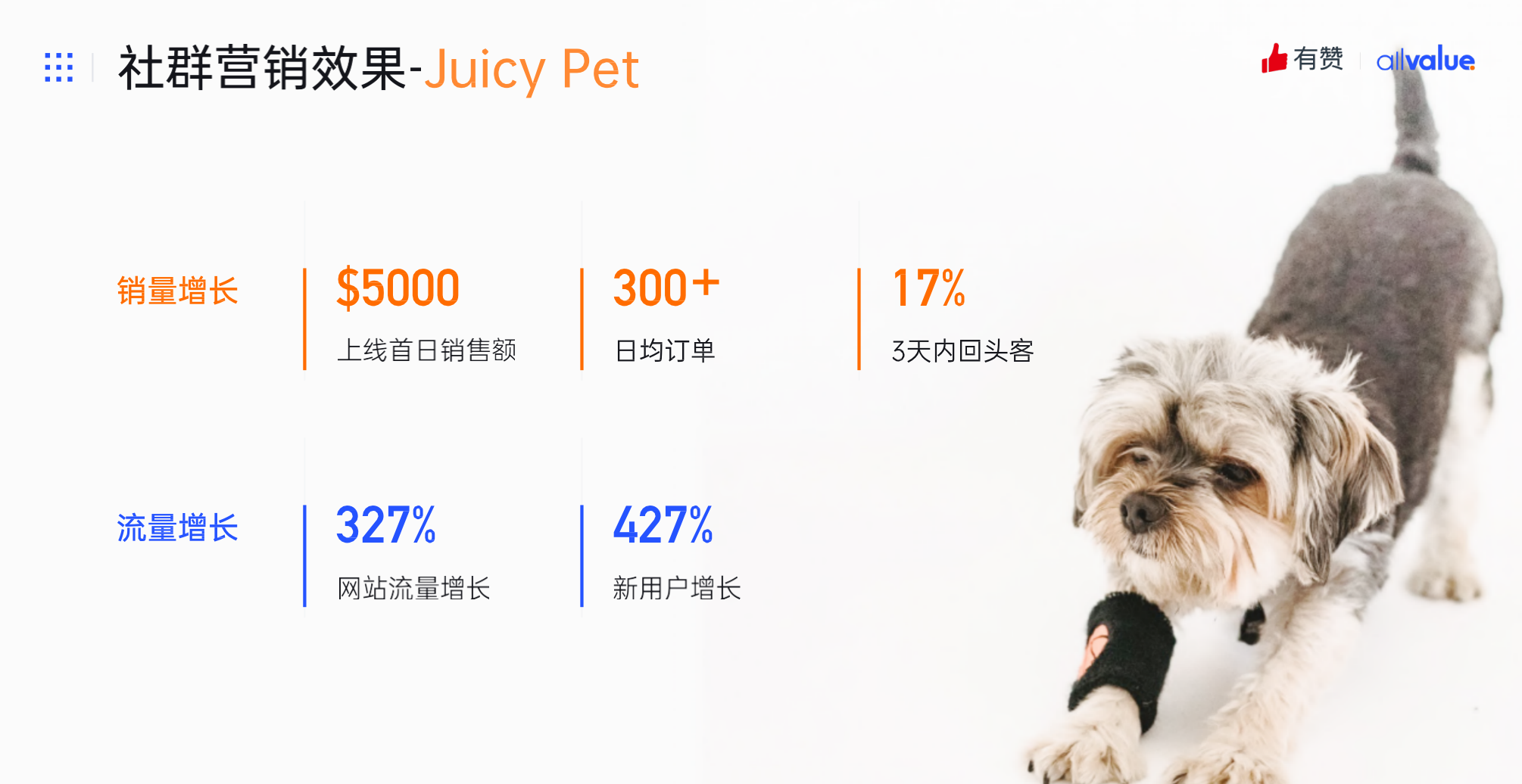 在首次社群营销活动结束后,AllValue持续追踪社群营销活动的后续效果,据统计,Juicy Pet独立站上线开展社群营销后的3天内回头客占比17%,远远高于行业平均值5%