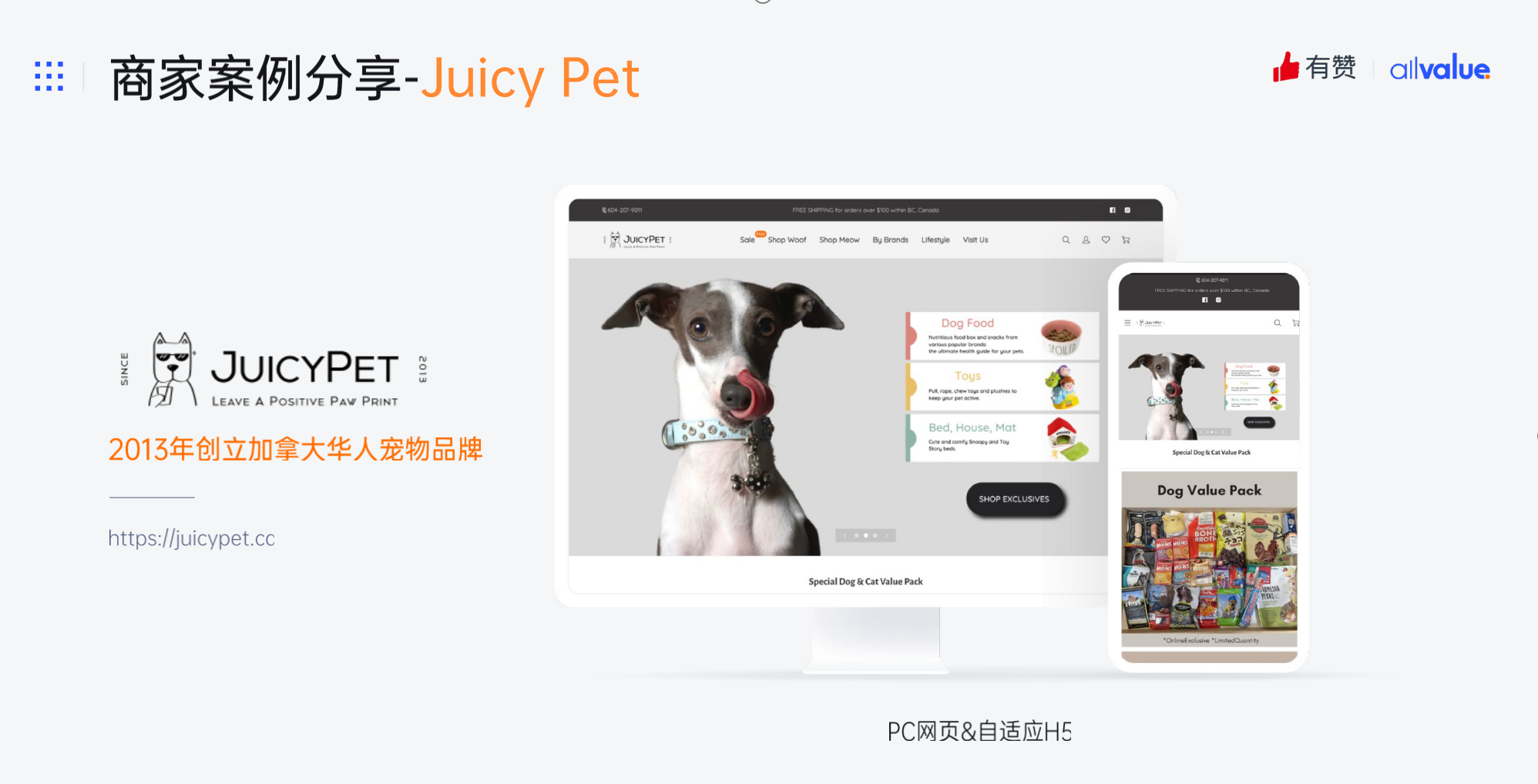 Juicy Pet独立站运营负责人Nadine表示:"Juicy Pet是一家宠物零售品牌,我们一直以来专注在线下实体店。在疫情期间,借助AllValue搭建了独立站,北美社群营销活动也很好地帮助我们在线上获取了更多流量和订单。未来,我们还将和AllValue合作参与更多营销活动,继续挖掘更多新增长。"