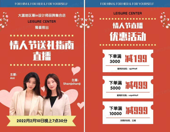 首先,根据llValue北美营销专家的建议,LeisureCenter敲定了两位垃经验丰富的华人美女担当本次直播的主播,美女自带的光环加上"以女性视角推出'情人节送礼儿指南'的直播定位,很快便为直播积蓄了第一波关注度。