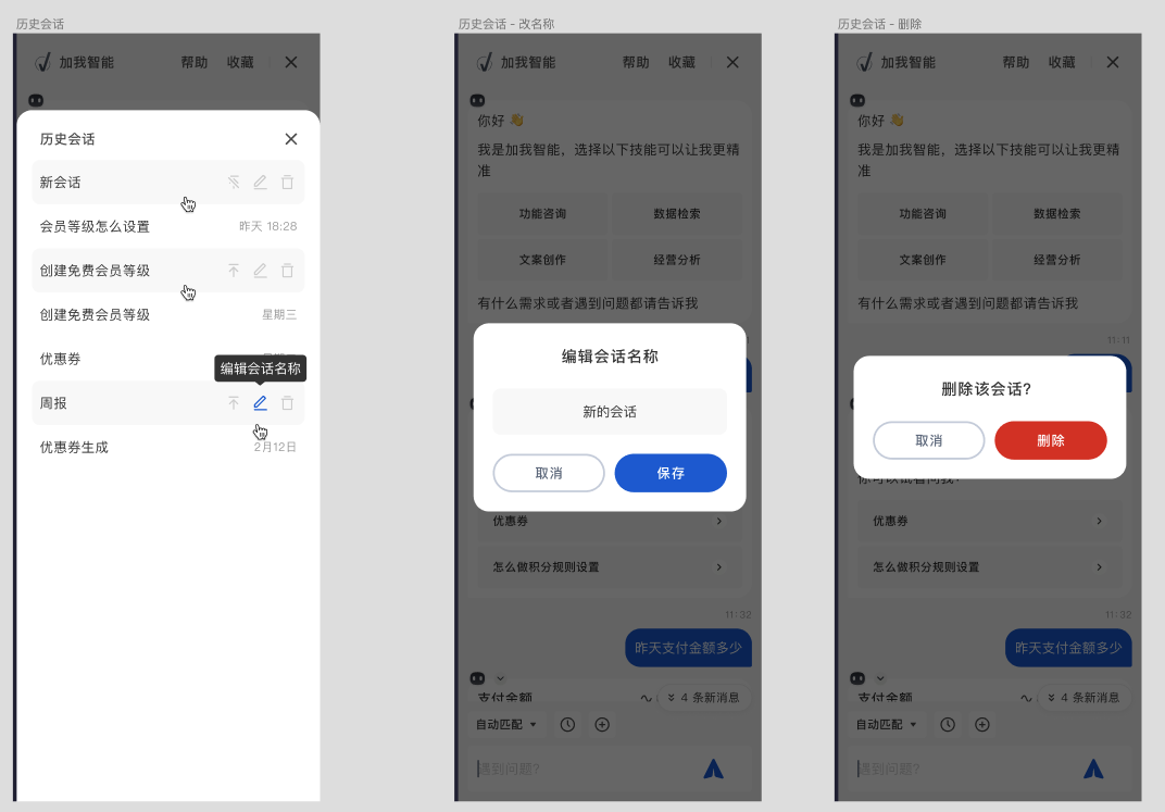 AI加我智能支持对历史会话进行管理,包括置顶、编辑会话名称、删除会话。