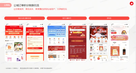 第二步【私域粉丝留存&变现】:如会员商城,公域订单转换引流,通过公域订单一键兑换小程序商城私域积分、优惠券、储值金等好礼,可完成公转私引导入会留存。