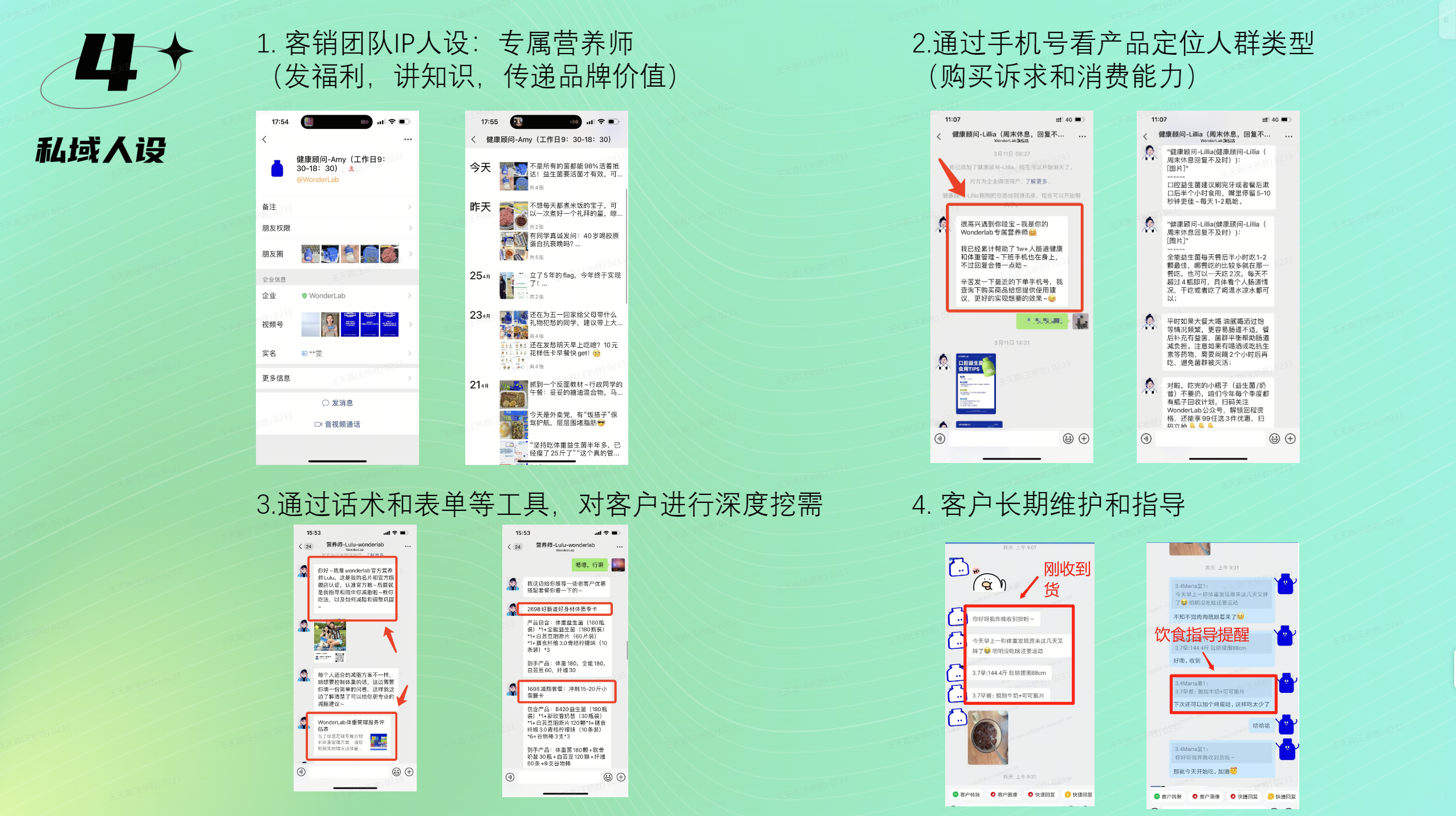 第四步完善私域人设。因为消费者进入私域后,我们需要与他们进行沟通。此时,在消费者面前展现怎样的形象,才能对他们更有吸引力呢?这就是我们搭建私域基础设施时需要考虑的问题。