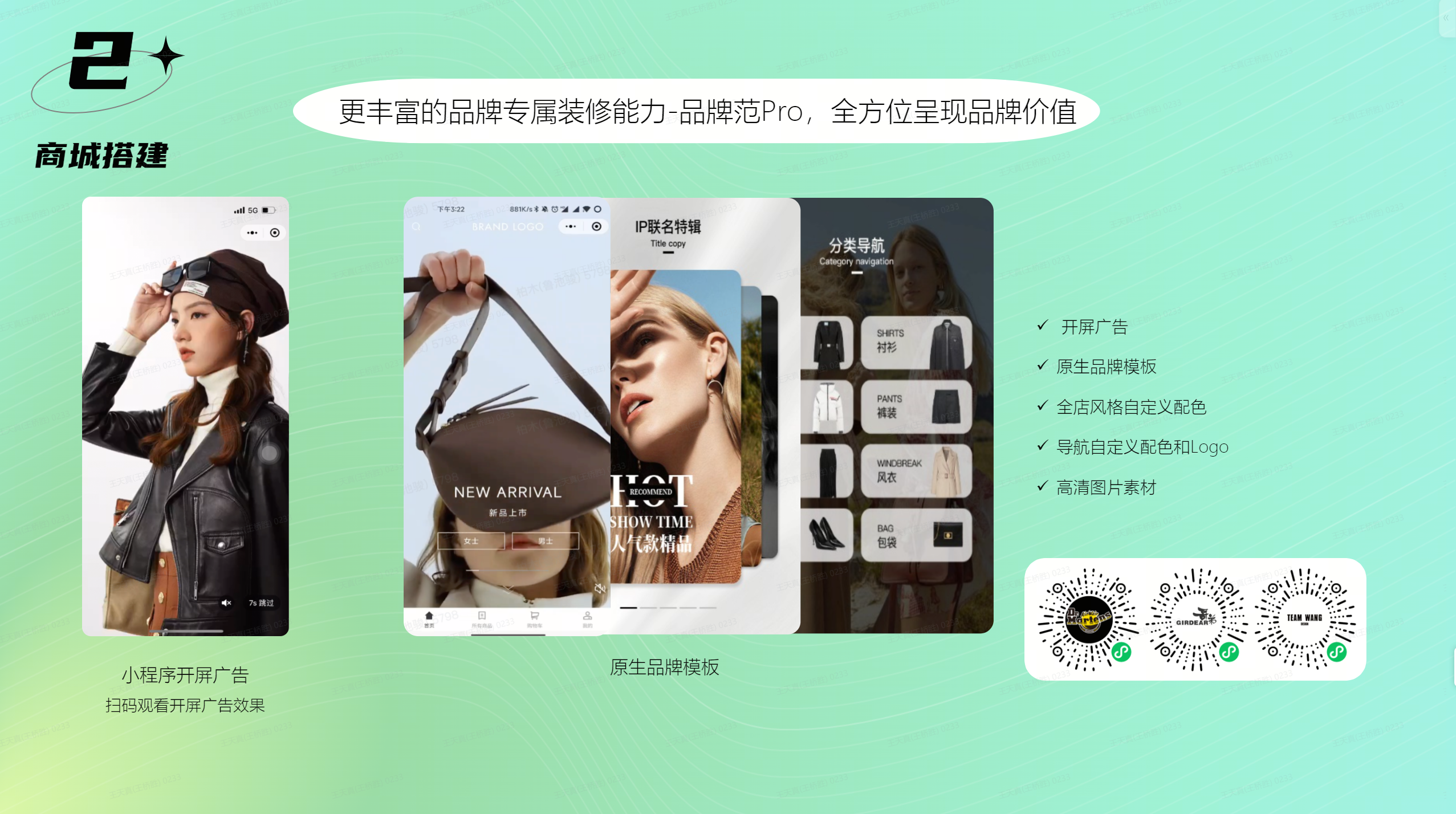 有赞推出了一款非常出色的产品,在小程序进入时会有一个完善的视频开屏广告,进入后还会有一些原生品牌模板,包括整个品牌的自定义配色。