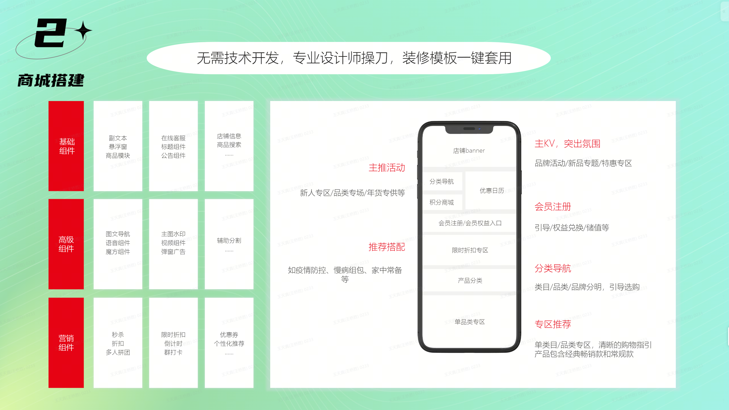 成为会员的第一步是公转私,第二步是搭建私域商品。事实上,有赞在长达 11 年的技术积累下,其商城已完全支持商家自定义搭建,你可以通过拖拽、图片设计等方式,将商城搭建成你想要的模式。此外,你还可以在商城中直接设置会员注册入口和限时折扣专区等功能。