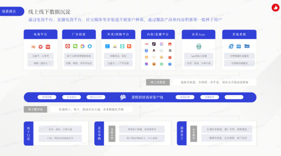 例如:门店的会员信息,包括平时我们会有一些门店导购,或者我们会有一些商家推的二维码,都可以通过各种渠道进入我们的客户池中。因此,线上线下所有的用户都可以共同沉淀在同一个客户池进行管理。