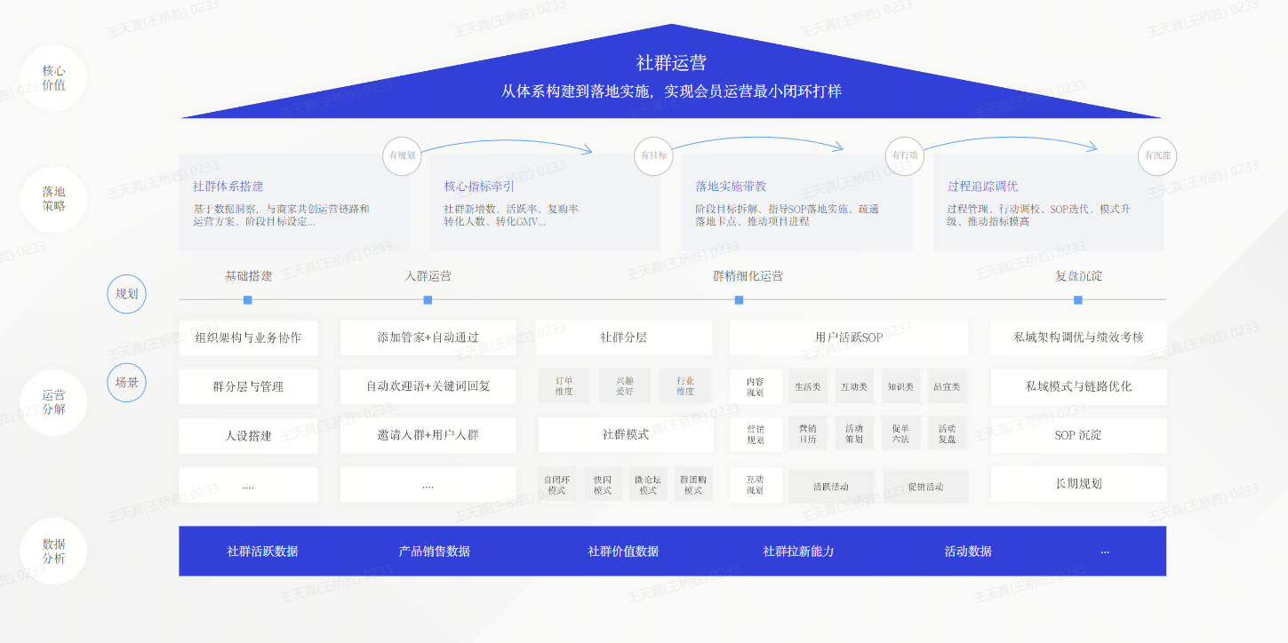 • 基础搭建:组织架构与业务协作、群分层与管理、人设搭建等,确保社群运营的基础框架稳定且高效。