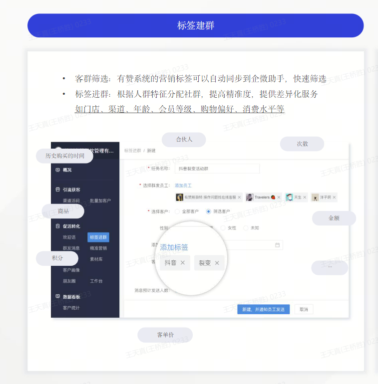 • 精准营销:在社群中,可以利用标签进行精准营销,比如通过群发消息、添加标签、积分等方式,提高客户参与度和活跃度。