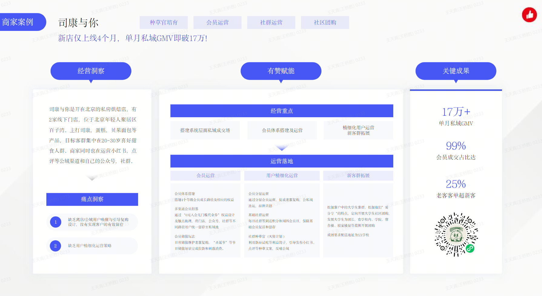 起初,他们专注于私房烘焙。我们在他们刚起步时就开始介入合作。他们的店铺位于白子湾,周边年轻人较多。他们主要提供贝果思康类产品。我们为他们制定了一个策略,首先从大学生团长入手,通过社群运营,与社区群团模式进行公转私引流。然后,我们将引流进来的所有用户信息与我们的会员体系相结合,进行完整的社群运营。整个体系运营了四个多月,他们的月收入和月 GMV 就已经突破了 17 万。而且,他们后来还表示,所有会员的成交率达到了 99% ,这是非常令人惊讶的成绩。