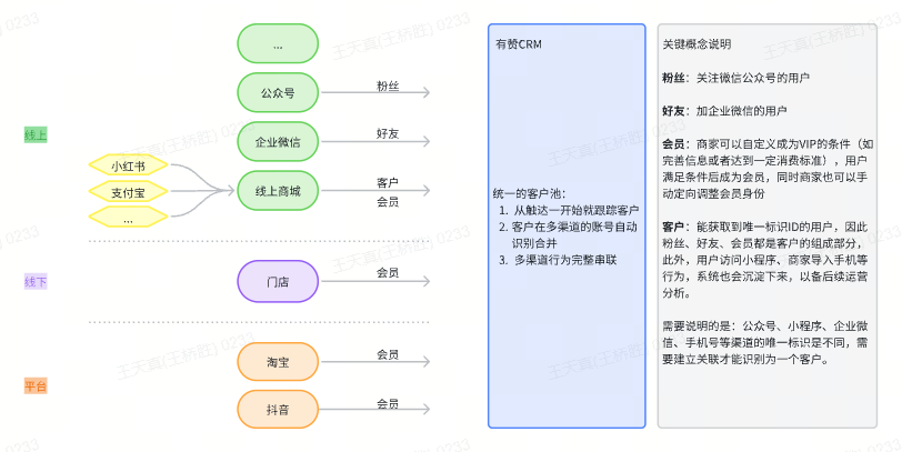 不同渠道作为独立系统,有自己对用户的id标识,有赞CRM在保证合规的情况下,通过跟各个系统的打通,引导用户授权,自动进行唯一用户的识别合并,能够将用户在多个平台下的行为完整串联。
