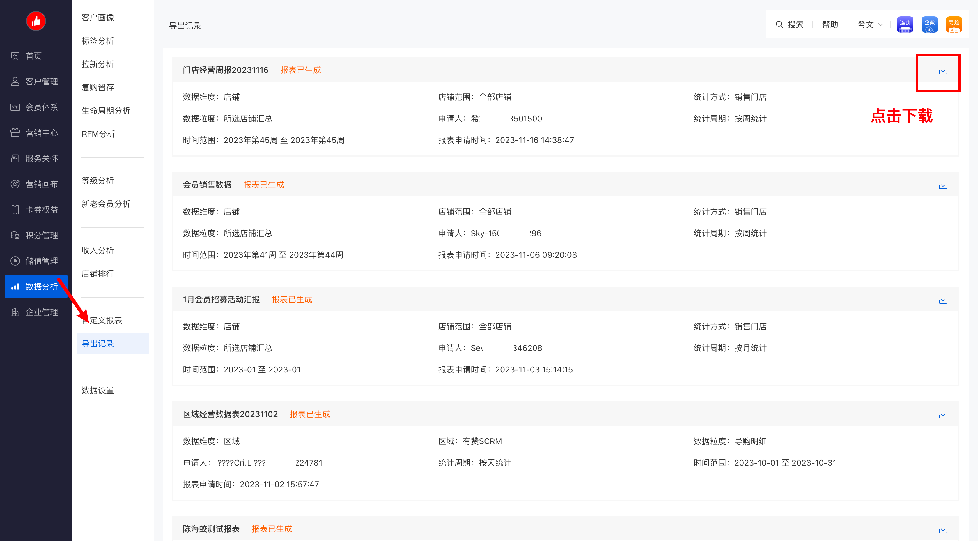 ○ 导出记录:记录历史导出情况,涵盖操作人、导出时间等,并支持重复下载报表