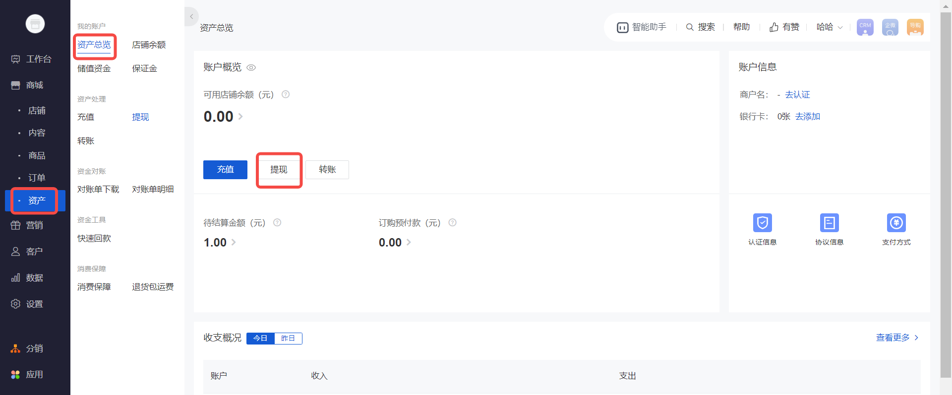 提现路径:有赞店铺后台-资产-提现(如下图)